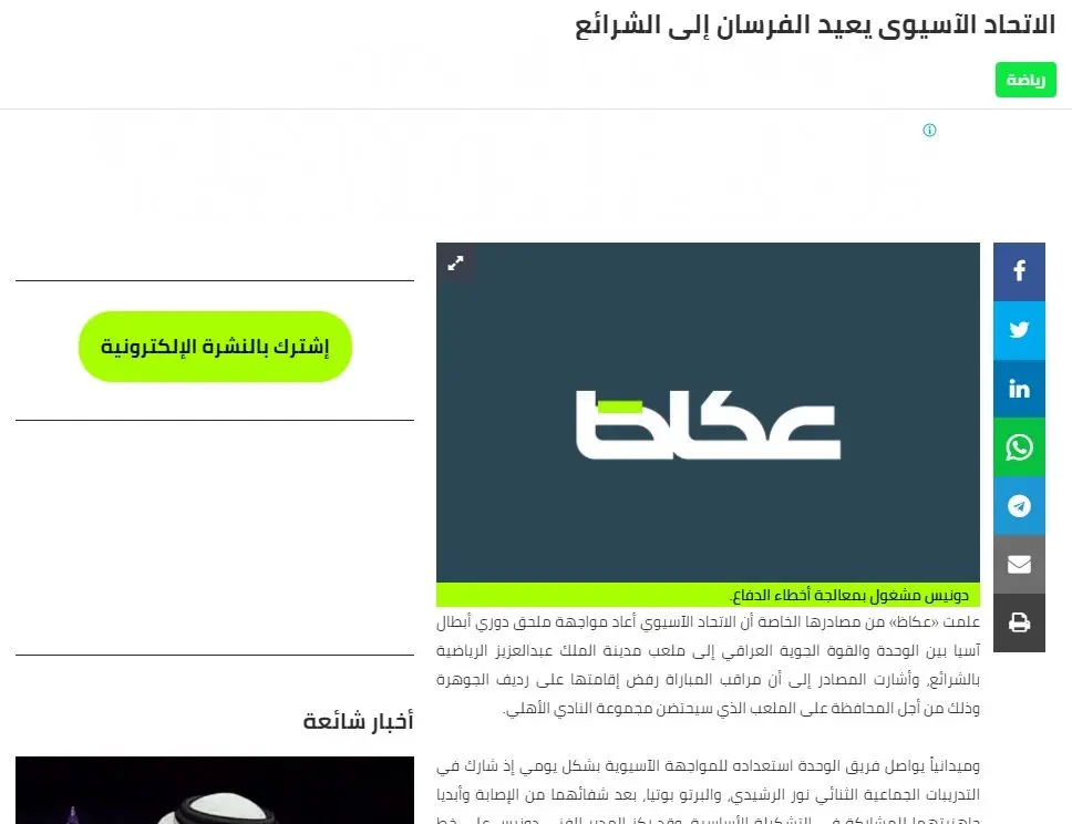 به گزارش منیبان، نشریه عکاظ عربستان نیز به مانند اغلب رسانه های ورزشی این کشور این روزها درگیر پوشش اخبار مربوط به میزبانی از بازی های مرحله گروهی لیگ قهرمانان آسیاست. این نشریه امروز خبری اعلام کرد ناظر کنفدراسیون فوتبال آسیا از برگزاری یک دیدار پلی آف بین تیم های الوحده امارات و نیروی هوایی عراق جلوگیری کرد و به دلیل خراب نشدن چمن ورزشگاه ملک فهد، دستور برگزاری بازی پلی آف را برای ورزشگاه ملک عبدالعزیر مکه صادر کرد.