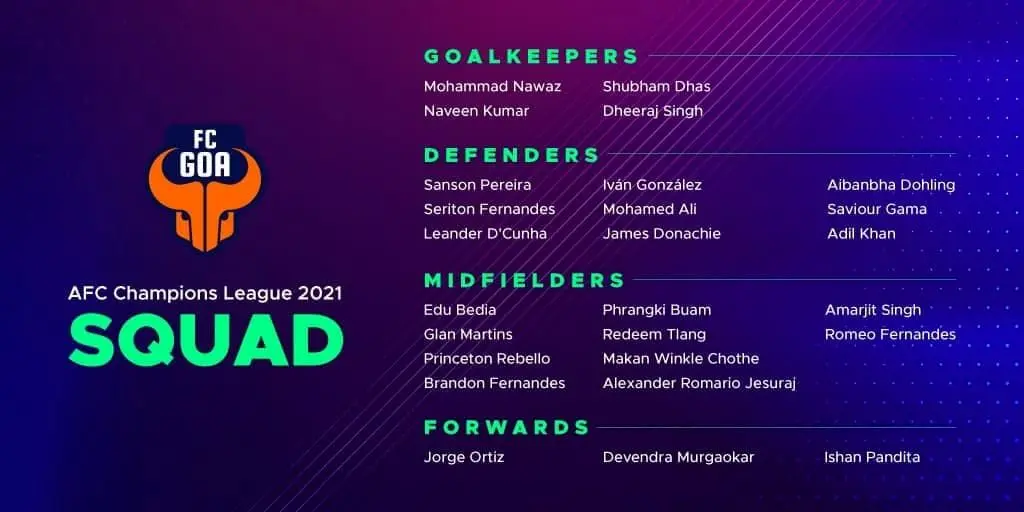 تیم گوای هند که در رقابت های لیگ قهرمانان آسیا 2021 در گروه تیم پرسپولیس قرار دارند امروز لیست نهایی خود را به ناظر ای اف سی تحوبل دادند. در لیست تیم هندی نام 26 بازیکن وارد شده است که در میان آنها 4 دروازه بان، 9 مدافع، 10 هافبک و 3 مهاجم دیده می شوند.