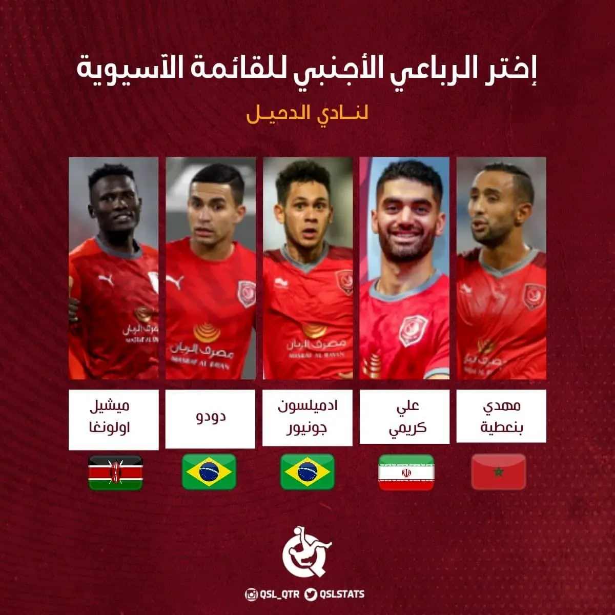 مهدی بن عطیه مراکشی، ادمیلسون جونیور و دودو برزیلی و مایکل اولانگای کنیایی چهار بازیکن خارجی الدحیل هستند ضمن اینکه علی کریمی بازیکن سابق استقلال جزو خارجی های الدحیل محسوب می شود ولی حضور او به عنوان سهمیه آسیایی الدحیل قطعی است.