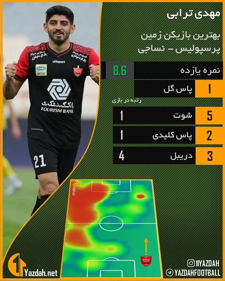ترابی که پس از اضافه شدن به خط حمله پرسپولیس توان هجومی این تیم را افزایش داده، امروز هم برابر نساجی فرصت‌های زیادی با پاس‌های در عمق و ارسال‌های خطرناک خود به وجود آورد که یکی از آنها همراه با گل شد.