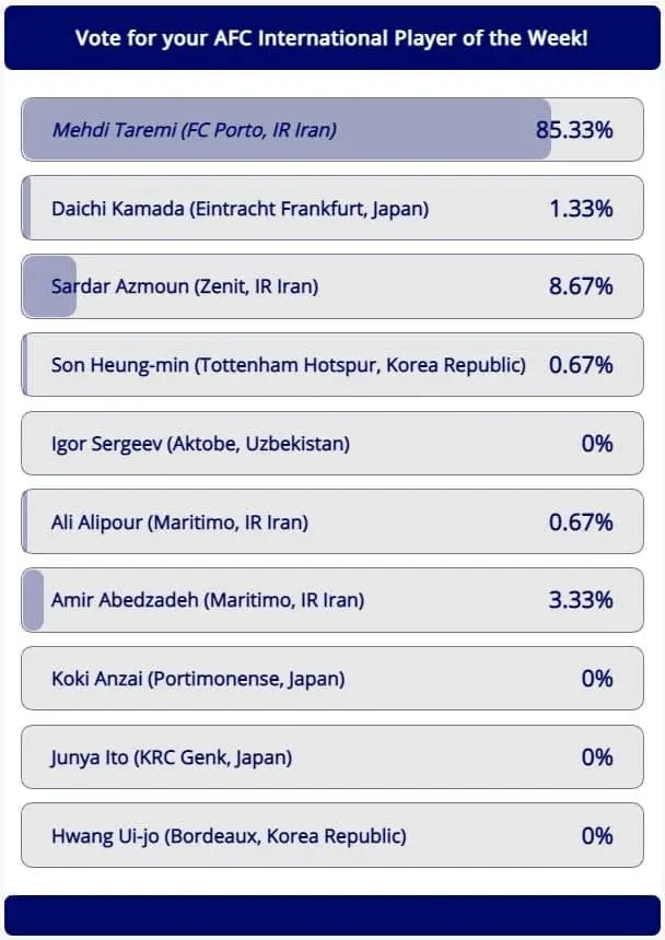 در ساعات ابتدایی این نظرسنجی شاهد پیشتازی مقتدرانه مهدی طارمی هستیم؛ اتفاقی که با توجه به درخشش او مقابل چلسی، پیش بینی آن کار سختی نبود.