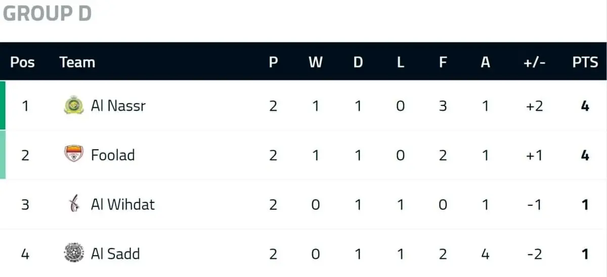 به گزارش منیبان؛ با این نتایج، النصر 4 امتیازی شد و در صدر قرار گرفت، فولاد نیز 4 امتیازی شد و بخاطر یک گل کمتر در رده دوم قرار گرفت و السد و الوحدات نیز 1 امتیازی ماندند.