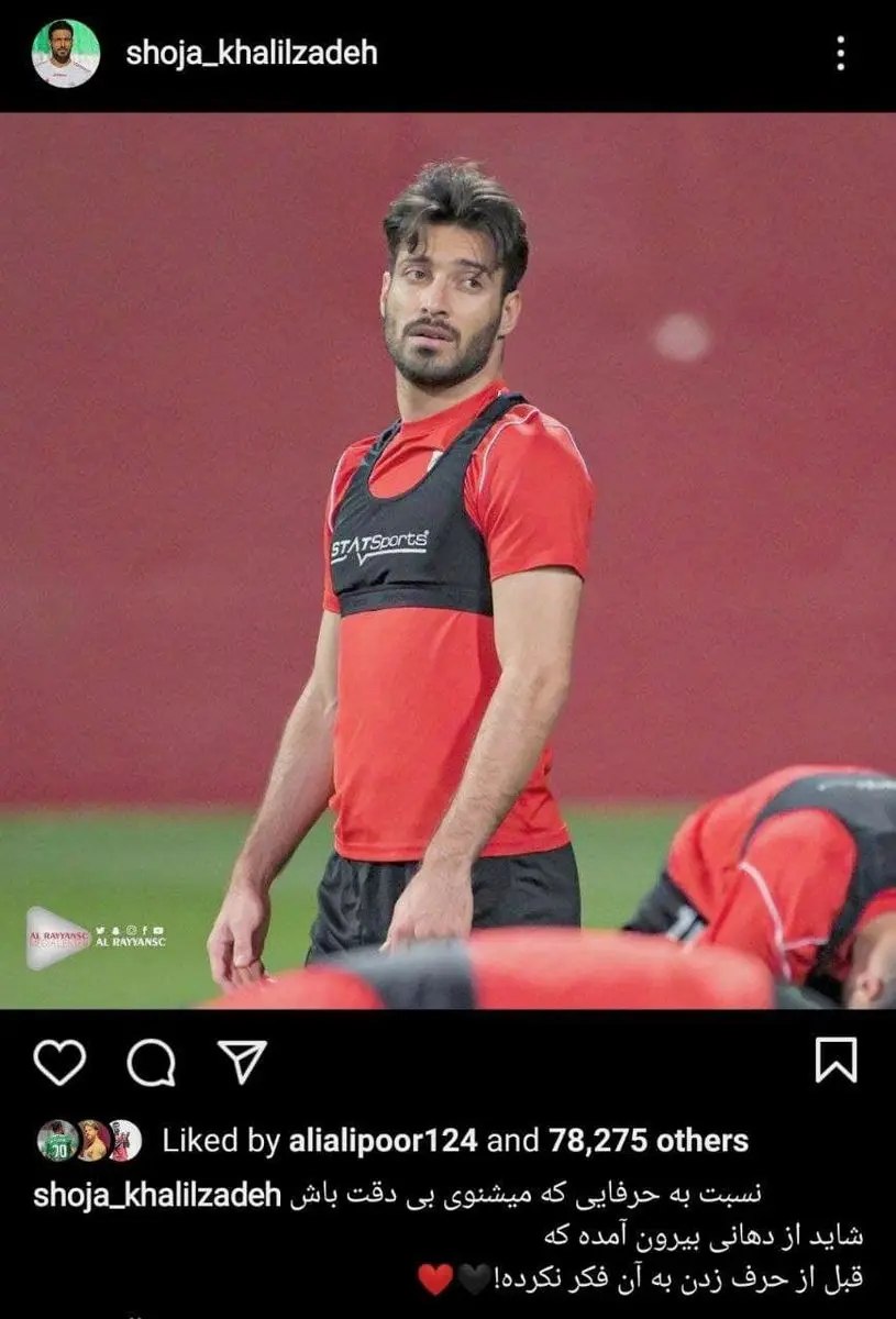 پست اینستاگرامی شجاع خلیل زاده، پس از شکست الریان برابر پرسپولیس