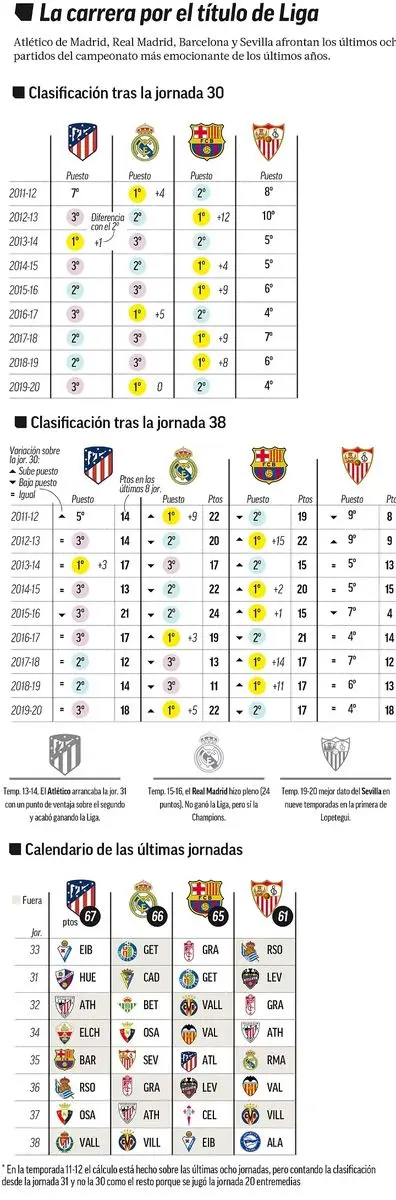 اول از همه باید به این نکته شاره کرد که از سال 2010 به بعد هر تیمی در هفته سی ام مسابقات صدرنشین بوده، در نهایت با حفظ جایگاهش به قهرمانی رسیده است. جدول فعلی لالیگا مطابق فصل 14-2013 است که طی آن اتلتیکو قهرمان شد و در آن سال نیز روخی بلانکو با تیم دوم، یک امتیاز و با تیم سوم، دو امتیاز فاصله داشتند و در نهایت قهرمان شدند. این موضوع اگر چه تضمین کننده هیچ چیزی نیست اما به نفع شاگردان دیگو سیمئونه است و می تواند روحیه آنها را افزایش دهد.