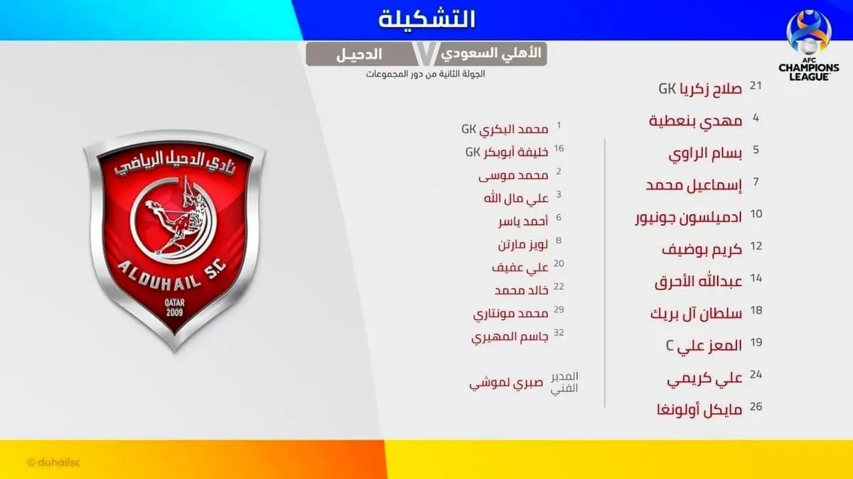 به گزارش منیبان، دو تیم الدحیل قطر و الاهلی عربستان امشب از ساعت 22:45 دقیقه به مصاف هم می روند و در همین راستا ترکیب الدحیل اعلام شده است که نام علی کریمی، بازیکن سابق استقلال، در آن به چشم می خورد.