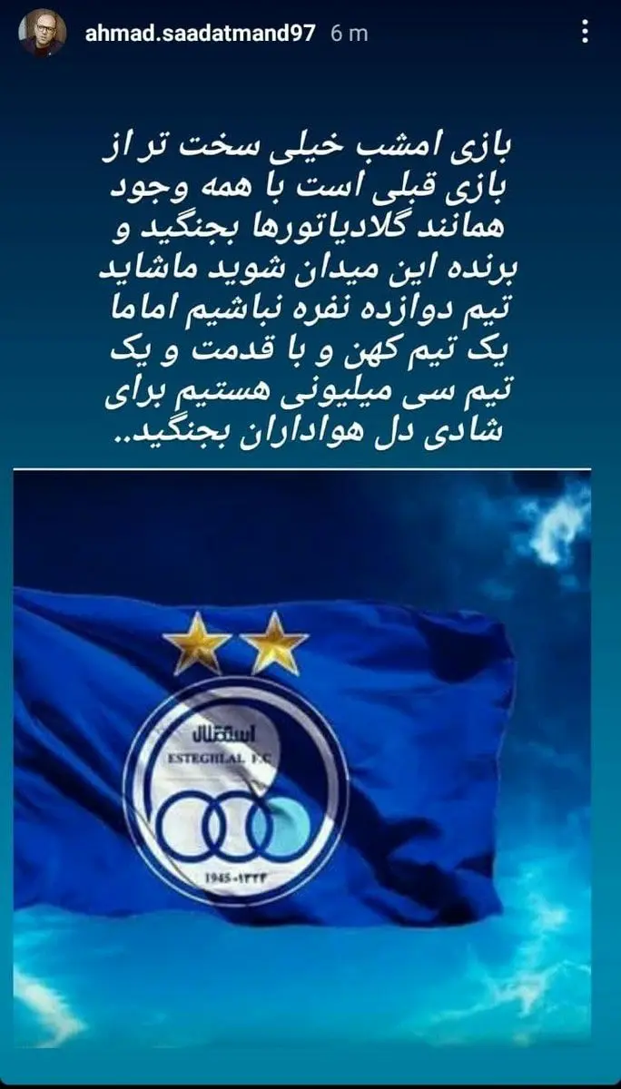 به گزارش منیبان، استقلال بامداد دوشنبه به مصاف الشرطه عراق می رود. تیمی سرسخت که در دیدارهای قبلی اش با آبی ها ایران ارزش های خود را نشان داده بود.در همین راستا احمد سعادتمند در استوری اینستاگرامی خود به حمایت از آبی ها پرداخته که البته خالی از طعنه هم نیست.