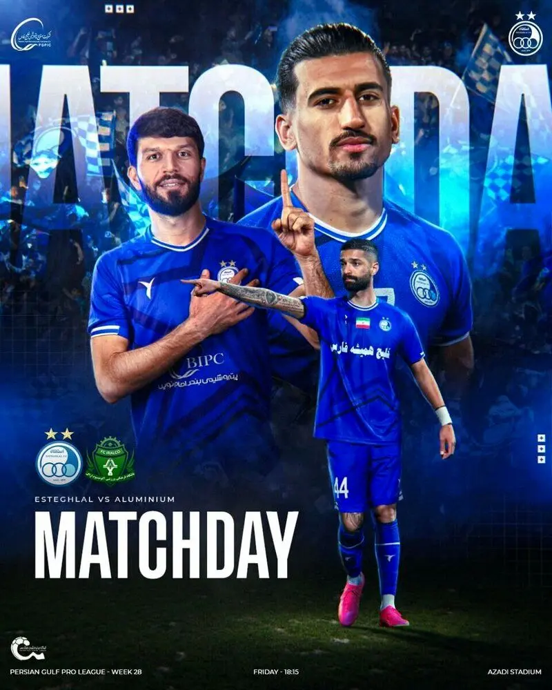 از هفته بیست و هشتم لیگ برتر، استقلال در ورزشگاه آزادی به مصاف آلومینیوم اراک میرود. باشگاه استقلال برای این دیدار پوستری با چهره جلال الدین ماشاریپوف، آرمین سهرابیان و صالح حردانی منتشر کرد.
