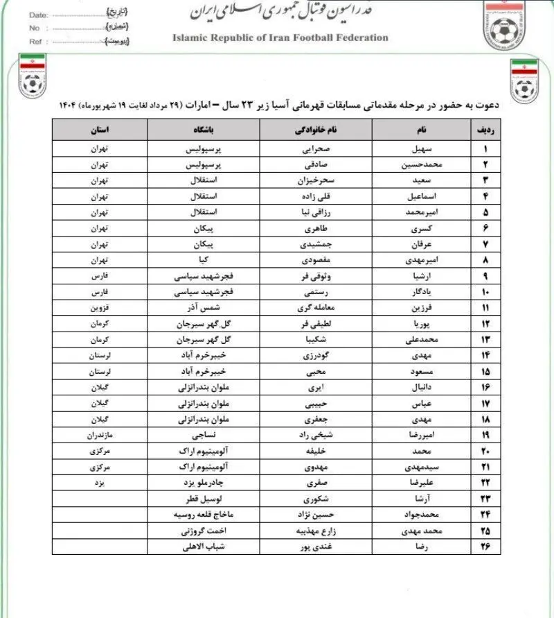 امید روانخواه، سرمربی تیم ملی فوتبال امید اسامی بازیکنان دعوت شده به اردو و حضور در مرحله مقدماتی مسابقات قهرمانی آسیا تیم ملی فوتبال زیر ۲۳ سال که از ۲۹ مرداد لغایت ۱۹ شهریورماه ۱۴۰۴ برگزار می شود، را اعلام کرد.