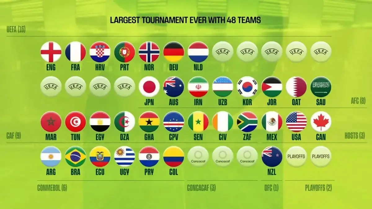 پس از برگزاری دیدارهای ملی در ماه نوامبر، حضور ۴۲ تیم در جام جهانی مشخص شده است. تیمهای باقیمانده در مارس ۲۰۲۶ مشخص خواهند شد، زمانی که تیمهای راهیافته به پلیآف با یکدیگر روبهرو میشوند.