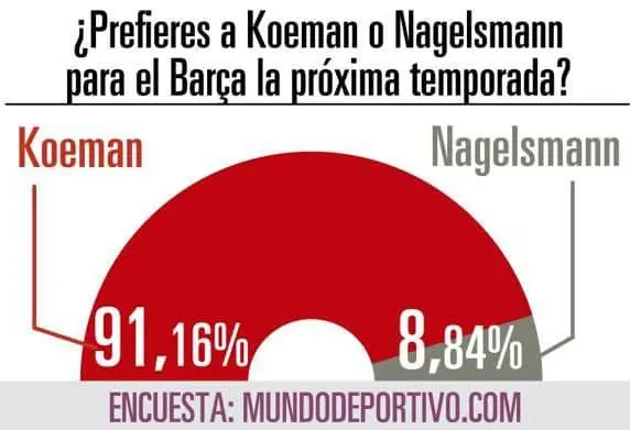 اما نشریه موندو دیپورتیوو در یک نظرسنجی از هواداران بارسلونا نظر آنها در مورد حضور جولیان ناگلسمان روی نیمکت یا ادامه همکاری با رونالد کومان را جویا شده است. جالب اینجاست علیرغم حذف اخیر از لیگ قهرمانان با شکست برابر پاری سن ژرمن، هواداران بارسلونا به رونالدکومان اعتماد دارند و نزدیک به 92 درصد از شرکت کنندگان علاقمند به همکاری با کومان به جای انتصاب جولیان ناگلسمان هستند. در صورت توافق با این سرمربی آلمانی، او کار دشواری برای جلب رضایت هواداران بارسلونا خواهد داشت.