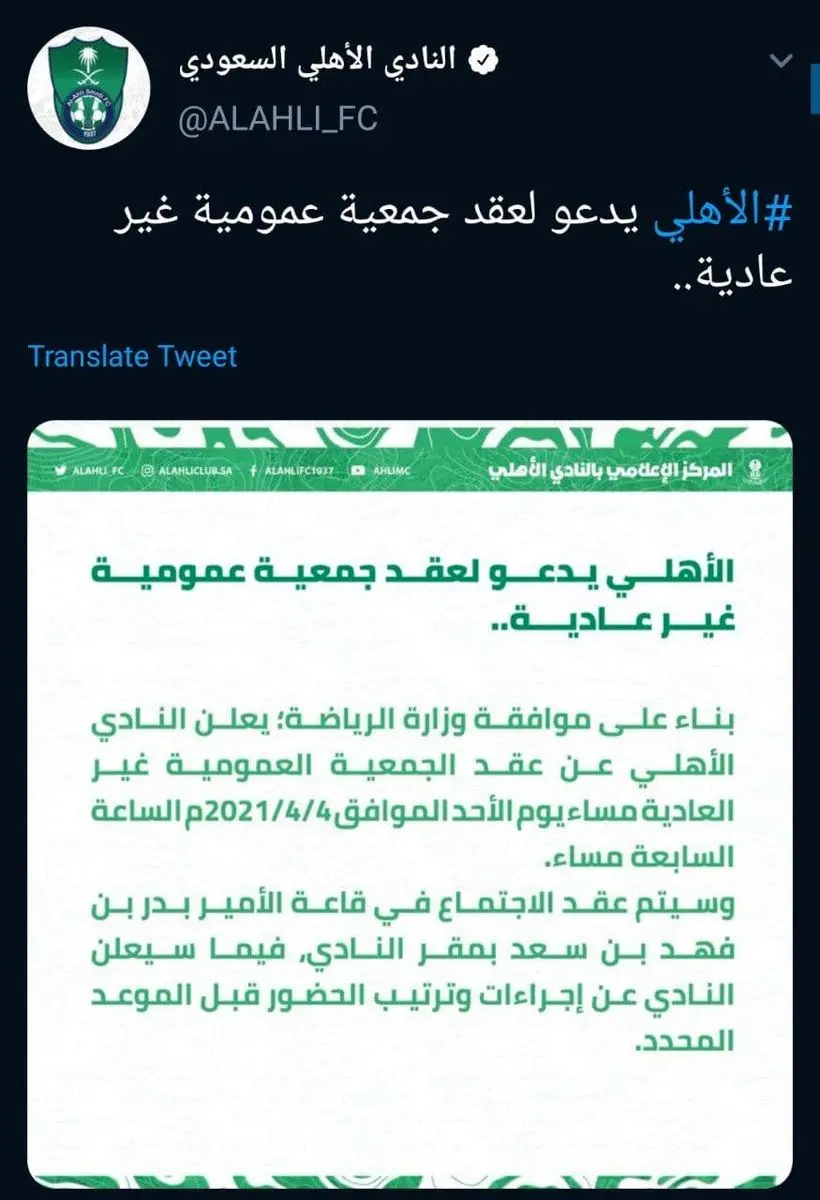 در این اطلاعیه اعلام شد که با کسب مجوز از وزارت ورزش عربستان، باشگاه الاهلی یک مجمع عمومی فوق العاده ای را در تاریخ 4 آپریل در مقر این باشگاه در محله الرحاب در جده برگزار می کند تا پیرامون مشکلات و نتایج ضعیف اخیر این تیم تصمیم گیری شود.